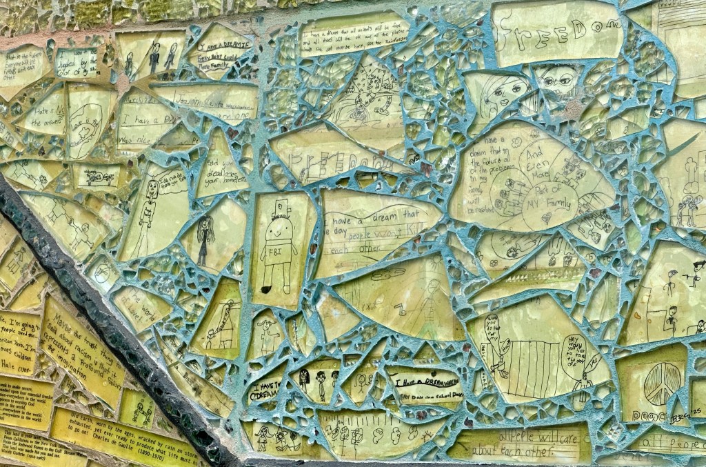 Part of the exterior of the Harvey Milk Civil Rights Academy- a public elementary school in San Francisco’s Castro district, where children are empowered in learning awareness, acceptance, nonviolence, and social justice; that rights are not a given, but must be fought for. Imagine if ALL schools included such a curriculum… I love this photo. The image itself is just cool. But the collage of Children’s hopes and dreams- profound. “Would you like to take a day off?” “I have a dream that one day people won’t kill each other…” and of course, “That all the tree will be okay…”