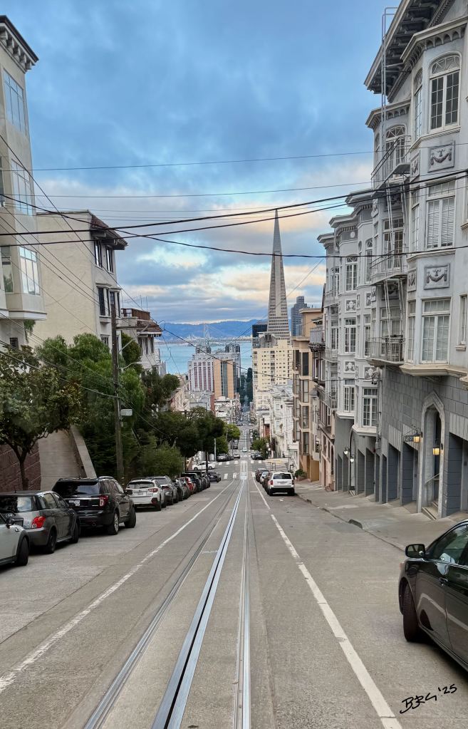 So many points of interest in this one. Angles, the buildings and windows, the sky, the depth. Taken at the crest of Nob Hill, looking down California Street.