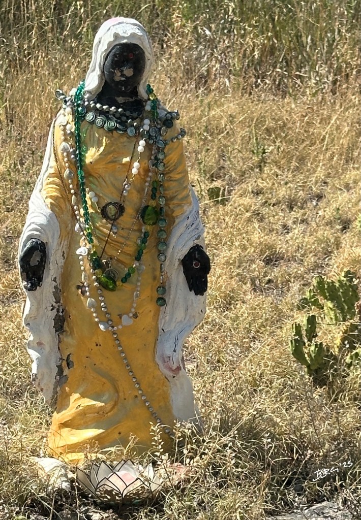 So much symbolism in this photo of the Black Madonna. Look at her face, look at the background, what’s around her, in front of her, to the right of her, how is it relevant to social justice issues at hand? Sanctuary Center, Sedalia, CO.