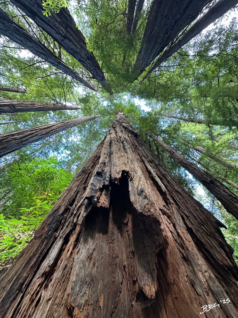 Muir Woods, CA (Imagine if you, as the viewer, were going to float upward in this image. Might you go up to the center toward the leaves and the sky? Or might you go up into that open layer of bark?)
