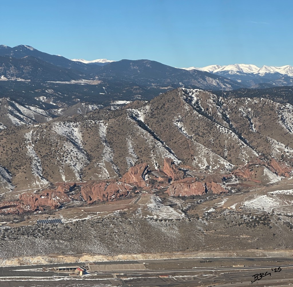 Flying helps bring a different perspective! Red Rocks, Morrison, CO on a crisp, blue sky January day.