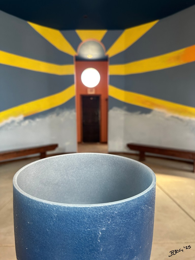 Inside the chapel at The Sanctuary Center, holding a singing bowl. Again, there is so much happening in this photo- so many curiosities, invitations…