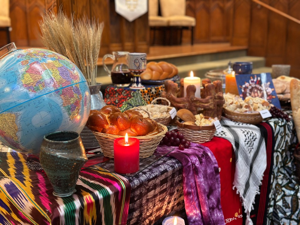 The communion table on World Communion Sunday at Calvary Baptist Church, Denver. Breads and cloths from around the world. (I also arranged the table.)
