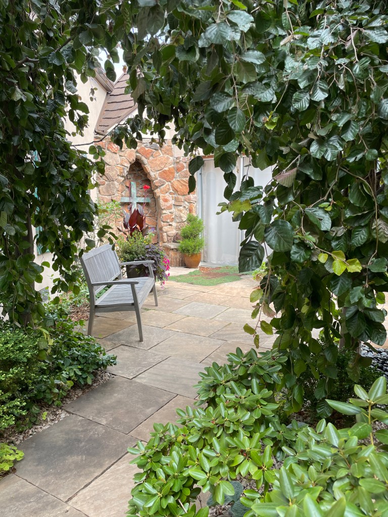 Dad’s cremains rest in The Foot of the Cross Courtyard at our church home, Calvary Baptist Church of Denver. It is such a lovely space full of reminders of life, as much or more than the reminders of death. A water fountain, flowers, plants, a breeze, the sun or rain, traffic nearby- all reminders of the living, are juxtaposed with that welcomed stillness of death: the columbarium and a common urn, statues, and stones, inscribed names, a bench to sit and be still. Our pastor, Anne, reminded us during the interment that, “So many significant moments in scripture happened outside in gardens!” The courtyard feels like one. One mention in particular touched me in a newly healing way when she said, “It was in the Garden of Gethsemane when Jesus cried out to God – asking God if there was any other way other than to endure this suffering…perhaps a cry Carl himself knew in his days in the hospital and rehab.”