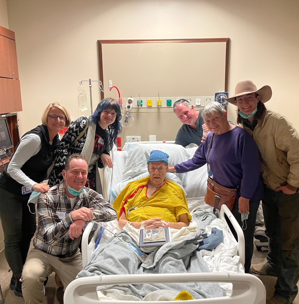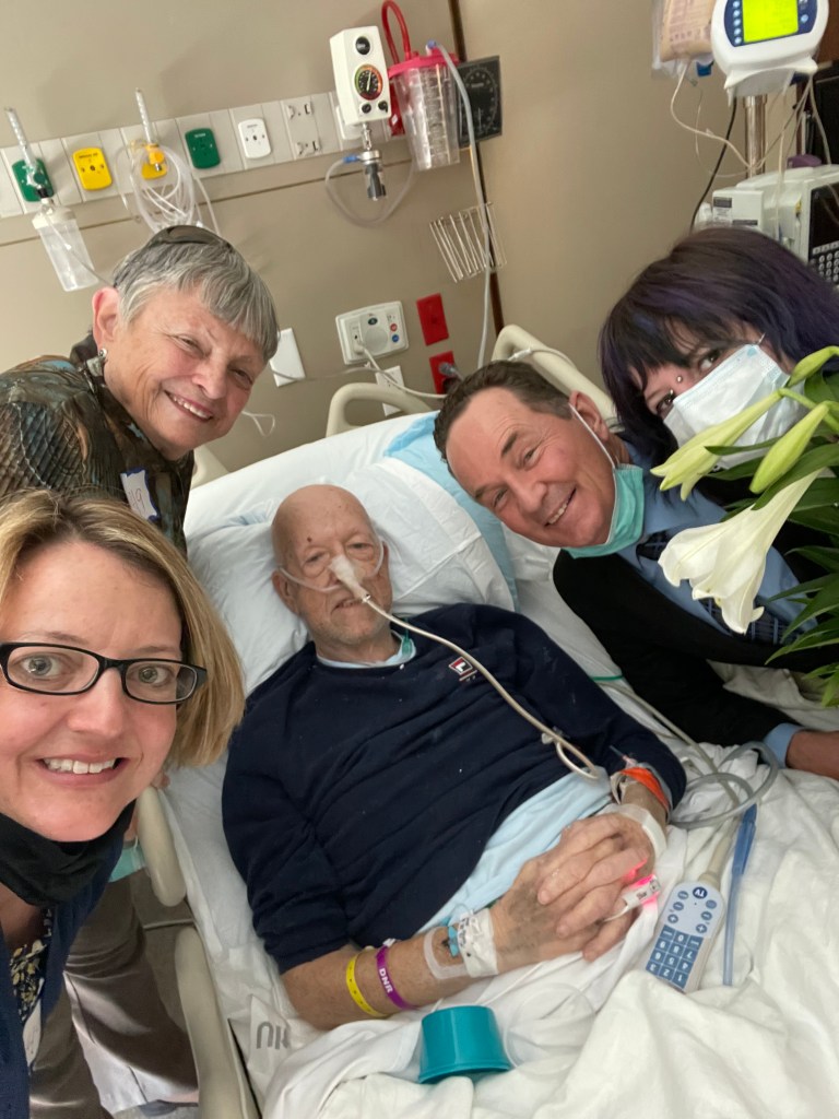 I hadn’t showered yet. I put on a couple more garments that would make me more acceptable in public, announced to my firstborn a summary of what I was told, texted my husband, best friends, and pastors, and drove to the hospital. It was a long drive, longer than the 20 minutes it takes to get there, even though I arrived in 20 minutes, and I don’t remember any of it. I quickly paced without running, making my way to the second floor Progressive Care Unit, the hallway seemingly stretching longer than usual (I have had nightmares of this happening before in the hospital I worked in, especially during the COVID pandemic). I noted trays and equipment outside Dad’s room, then coming around the corner to see my parents’ friends standing back while a sea of blue scrubs surrounded my dad, hollering out instructions and demands to each other, mom near him on the other side of the bed. One of my mom and dad’s long time friends, Bill, whom I lovingly call, “Uncle Willie” took me in his arms and offered words of encouragement. I then approached my dad, he reached out his hand, and I took it. He was gasping for air. His body and effort maxed out in a massive attempt to pull in as much oxygen as possible. He had grown so weak over the last several weeks, and yet, it seemed he suddenly had the power of an ox in his body’s instinct to try and survive. Every single muscle working. Head to toe. The doctor reiterated that normally in a situation like this, they would have taken Dad down to ICU and intubated him. But my dad was a DNR. I knew he did not want that, too. So they had the oxygen mask over his nose and mouth, and cranked up as high as it would possibly go. They had suctioned as much vomit as they could out of his mouth and lungs. They could not use the B-pap, as that would have caused more damage to his fragile lungs that were recovering from pneumonia. What a drastic shift from last night, and even from this morning’s cheery nurse report, when he needed very little O2 in his nasal cannula. The crackle of vomit in his lungs increased and decreased in its rhythmic in and out mingling with the air. He looked at me with his longing blue eyes. A couple of times, he tried to reach his oxygen mask with his hand, and I assumed he wanted to say something. But he was so weak, only his finger tips could touch the very bottom of his mask, before his arm would flop back down to his side. (I had nightmares of that moment, wondering what he wanted to say, what was left unsaid.) I also knew how frustrated he had been suddenly not being able to hear very well these past few weeks (a side effect from the brain radiation). He must have felt so alone at times because of that hearing loss, even while being surrounded by people. When his languishing eyes locked with mine, I looked back, a pooling of tears soon to spill, and said, “I’m right here, Dad. I will do right by you.”
